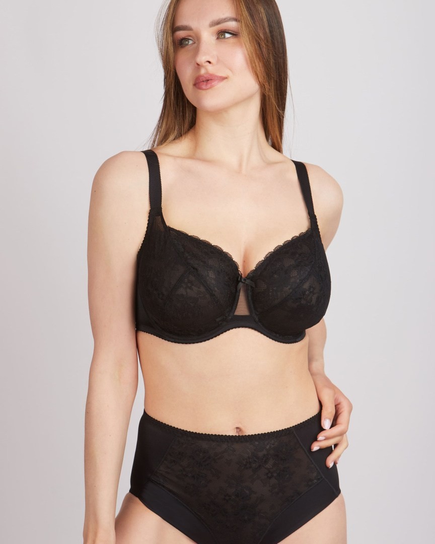 Sutien cu suport din metal. Cupe moi cu trei straturi, captusite cu tesatura din tricotaj neelastic. Detaliu decorativ transparent pe partea centrala a sutienului. Fundita decorativa pe mijloc. Sistem de inchidere format din doua carlige cu patru linii de reglare.