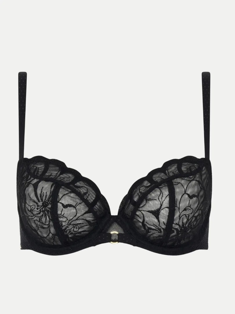 Sutien demi cu cupe semicirculare căptușite, cu osatură. Fermoar clasic pe spate. Bretele reglabile.