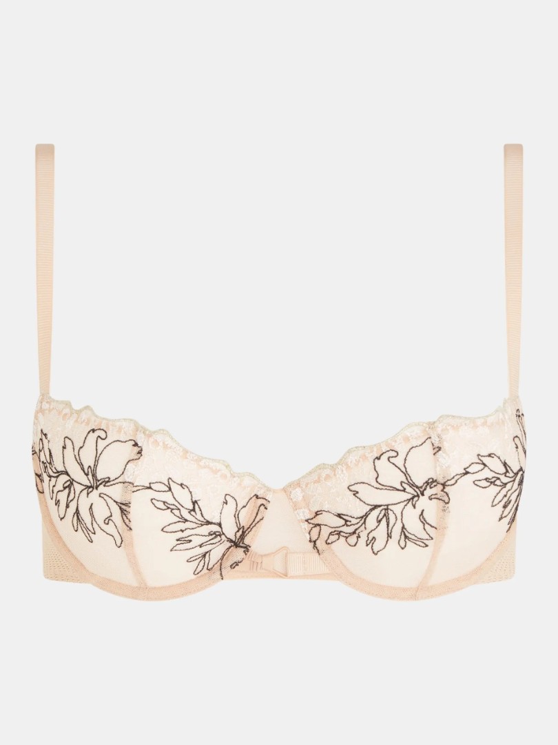 Sutien demi pe carcas. Cupe semicirculare moi. Tul elastic și broderie delicată cu margini franjurate.